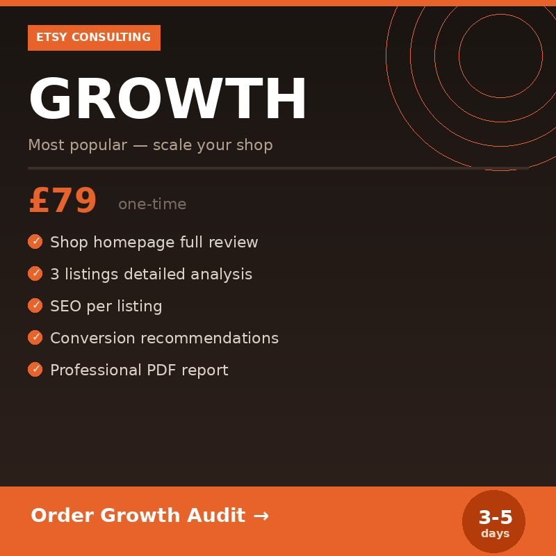 The Growth package gave me a complete picture of my shop's strengths and weaknesses. The recommendations were prioritised, so I knew exactly where to start. The impact on my Etsy traffic was visible within the first month. This is the kind of expert input that no YouTube tutorial can replace.